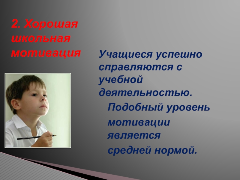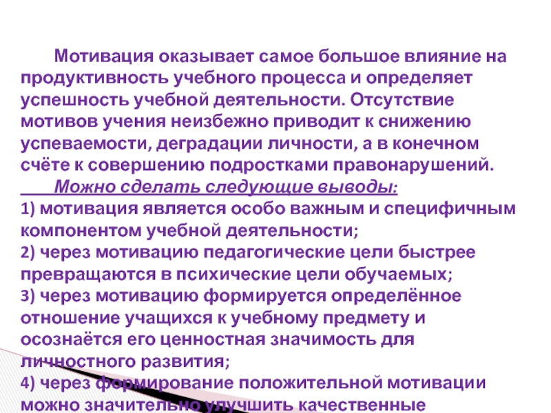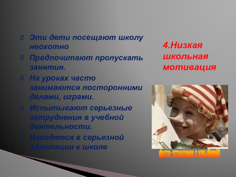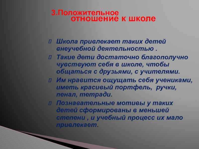 Познавательные мотивы у таких детей сформированы в меньшей степени , и учебный процесс их мало привлекает.