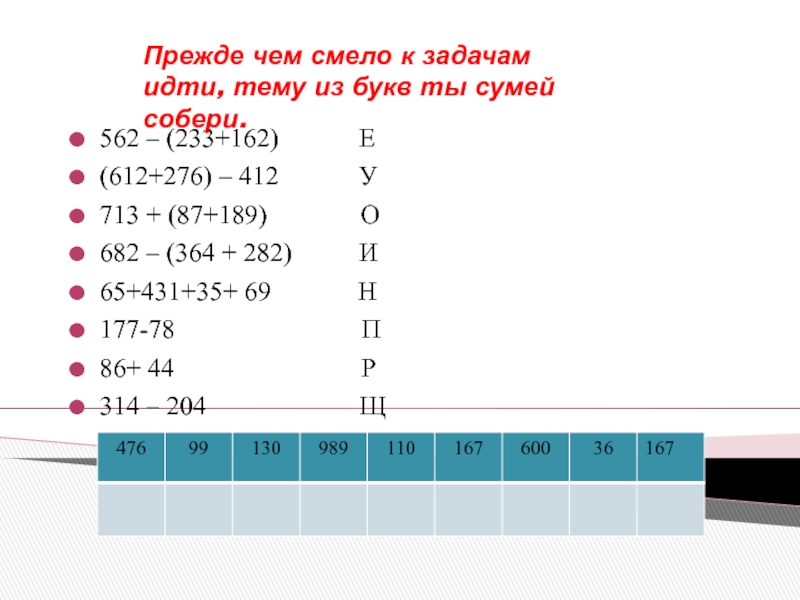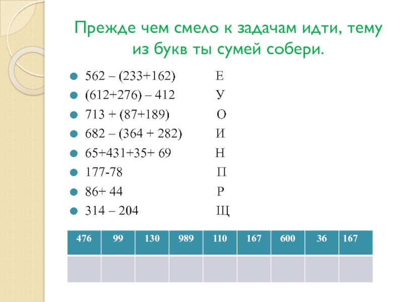 Прежде чем смело к задачам идти, тему из букв ты сумей собери.