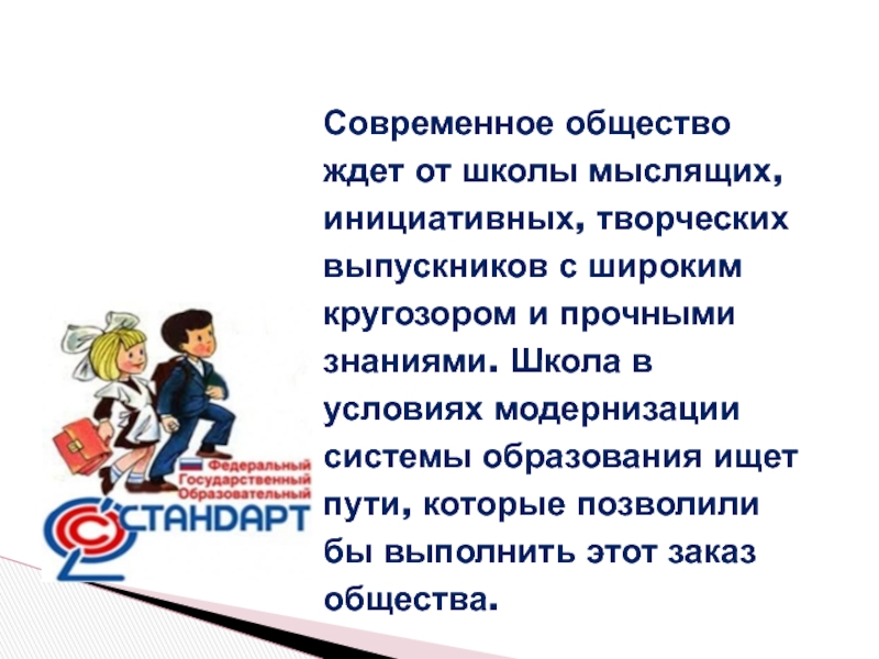 Современное общество ждет от школы мыслящих, инициативных, творческих выпускников с широким кругозором и прочными знаниями. Школа в условиях модернизации системы образования ищет пути, которые позволили бы выполнить этот заказ общества.