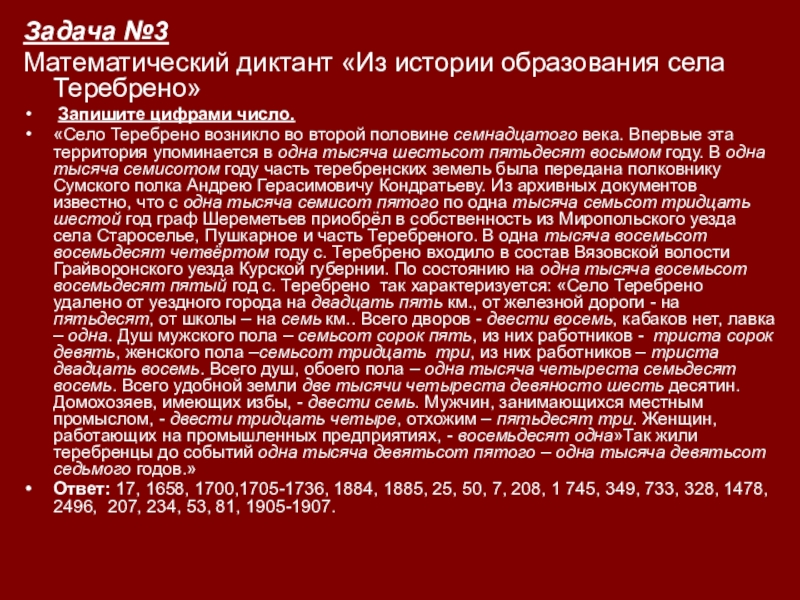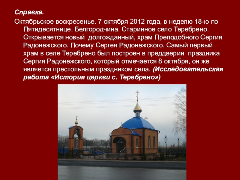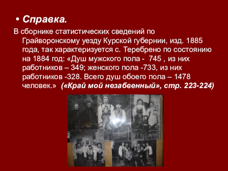 «Село Теребрено возникло во второй половине семнадцатого века. Впервые эта территория упоминается в одна тысяча шестьсот пятьдесят восьмом году. В одна тысяча семисотом году часть теребренских земель была передана полковнику Сумского полка Андрею Герасимовичу Кондратьеву. Из архивных документов известно, что с одна тысяча семисот пятого по одна тысяча семьсот тридцать шестой год граф Шереметьев приобрёл в собственность из Миропольского уезда села Староселье, Пушкарное и часть Теребреного. В одна тысяча восемьсот восемьдесят четвёртом году с. Теребрено входило в состав Вязовской волости Грайворонского уезда Курской губернии. По состоянию на одна тысяча восемьсот восемьдесят пятый год с. Теребрено так характеризуется: «Село Теребрено удалено от уездного города на двадцать пять км., от железной дороги - на пятьдесят, от школы – на семь км.. Всего дворов - двести восемь, кабаков нет, лавка – одна. Душ мужского пола – семьсот сорок пять, из них работников - триста сорок девять, женского пола –семьсот тридцать три, из них работников – триста двадцать восемь. Всего душ, обоего пола – одна тысяча четыреста семьдесят восемь. Всего удобной земли две тысячи четыреста девяносто шесть десятин. Домохозяев, имеющих избы, - двести семь. Мужчин, занимающихся местным промыслом, - двести тридцать четыре, отхожим – пятьдесят три. Женщин, работающих на промышленных предприятиях, - восемьдесят одна»Так жили теребренцы до событий одна тысяча девятьсот пятого – одна тысяча девятьсот седьмого годов.»