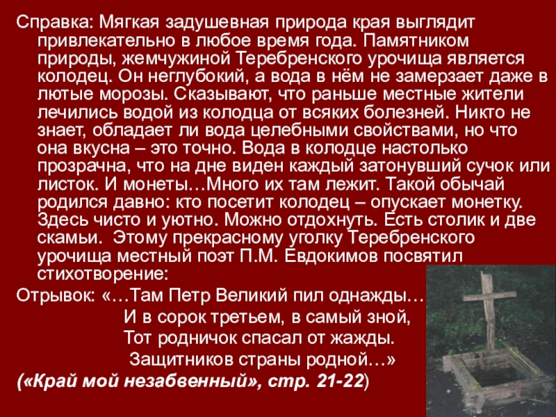 Памятником природы, жемчужиной Теребренского урочища является колодец. Он неглубокий, а вода в нём не замерзает даже в лютые морозы. Сказывают, что раньше местные жители лечились водой из колодца от всяких болезней. Никто не знает, обладает ли вода целебными свойствами, но что она вкусна – это точно. Вода в колодце настолько прозрачна, что на дне виден каждый затонувший сучок или листок. И монеты…Много их там лежит. Такой обычай родился давно: кто посетит колодец – опускает монетку. Здесь чисто и уютно. Можно отдохнуть. Есть столик и две скамьи. Этому прекрасному уголку Теребренского урочища местный поэт П.М. Евдокимов посвятил стихотворение: