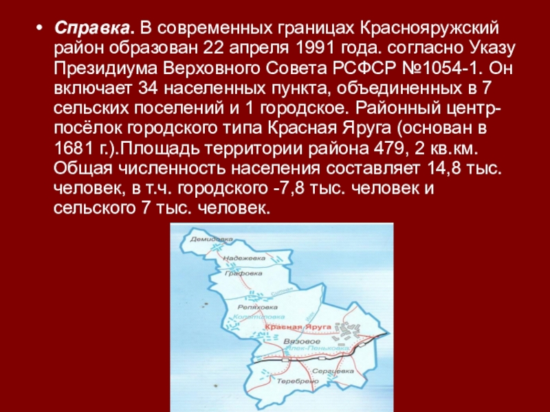 Справка. В современных границах Краснояружский район образован 22 апреля 1991 года.