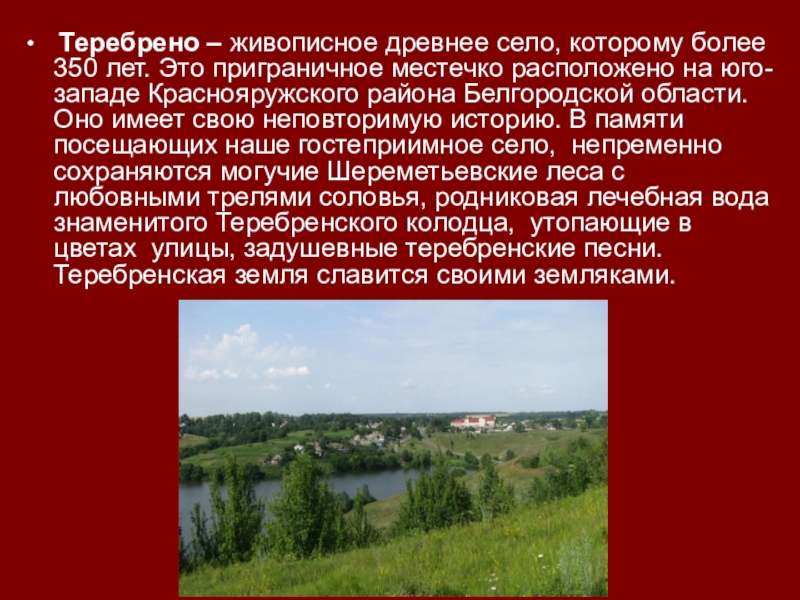 приграничное местечко расположено на юго-западе Краснояружского района Белгородской области. Оно имеет свою неповторимую историю. В памяти посещающих наше гостеприимное село, непременно сохраняются могучие Шереметьевские леса с любовными трелями соловья, родниковая лечебная вода знаменитого Теребренского колодца, утопающие в цветах улицы, задушевные теребренские песни. Теребренская земля славится своими земляками.