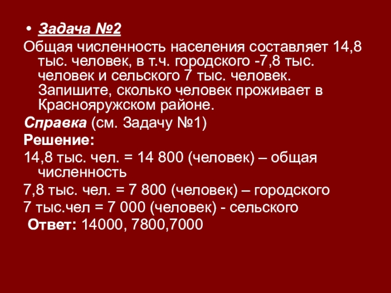 -7,8 тыс. человек и сельского 7 тыс. человек. Запишите, сколько человек проживает в Краснояружском районе.