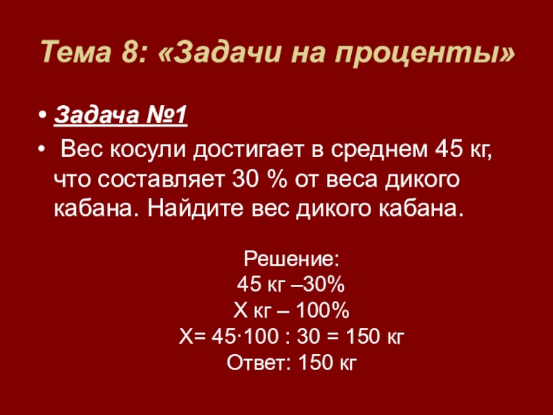 кг, что составляет 30 % от веса дикого кабана. Найдите вес дикого кабана.