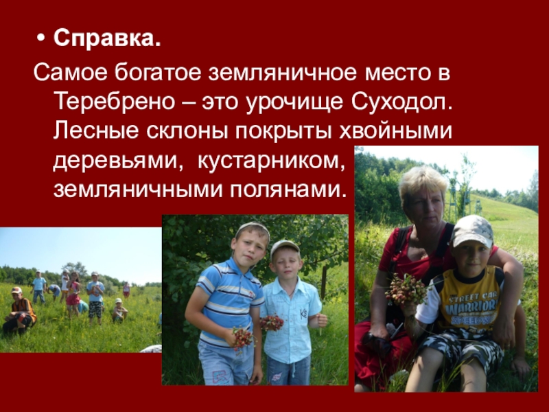 Самое богатое земляничное место в Теребрено – это урочище Суходол. Лесные склоны покрыты хвойными деревьями, кустарником, земляничными полянами.