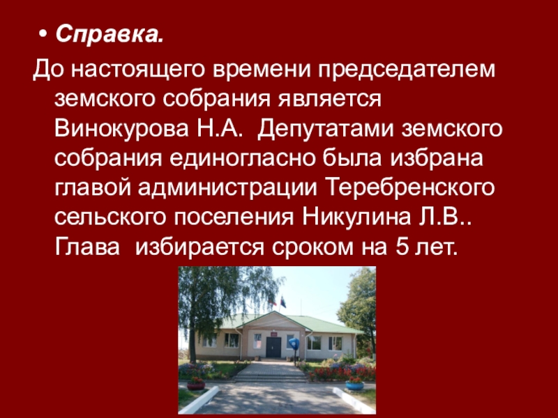 До настоящего времени председателем земского собрания является Винокурова Н.А. Депутатами земского собрания единогласно была избрана главой администрации Теребренского сельского поселения Никулина Л.В.. Глава избирается сроком на 5 лет.