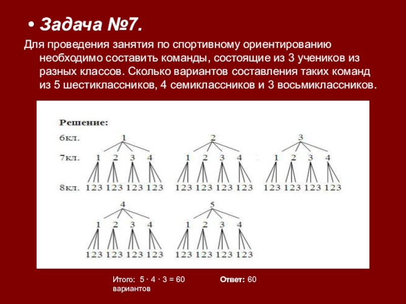 Итого: 5 · 4 · 3 = 60 Ответ: 60 вариантов