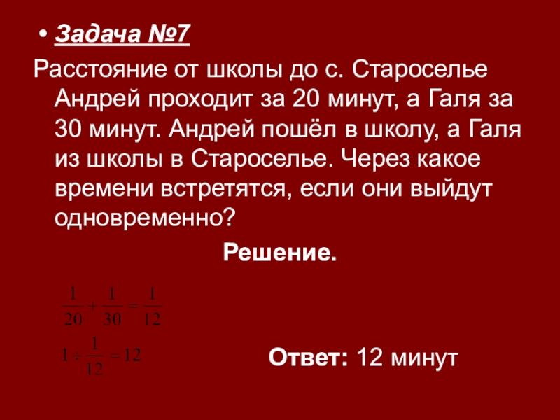 минут, а Галя за 30 минут. Андрей пошёл в школу, а Галя из школы в Староселье. Через какое времени встретятся, если они выйдут одновременно?