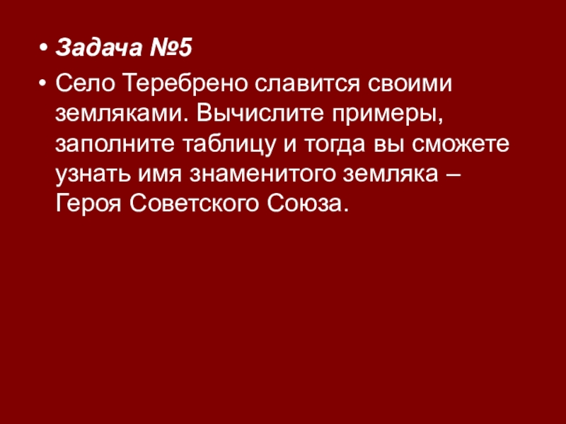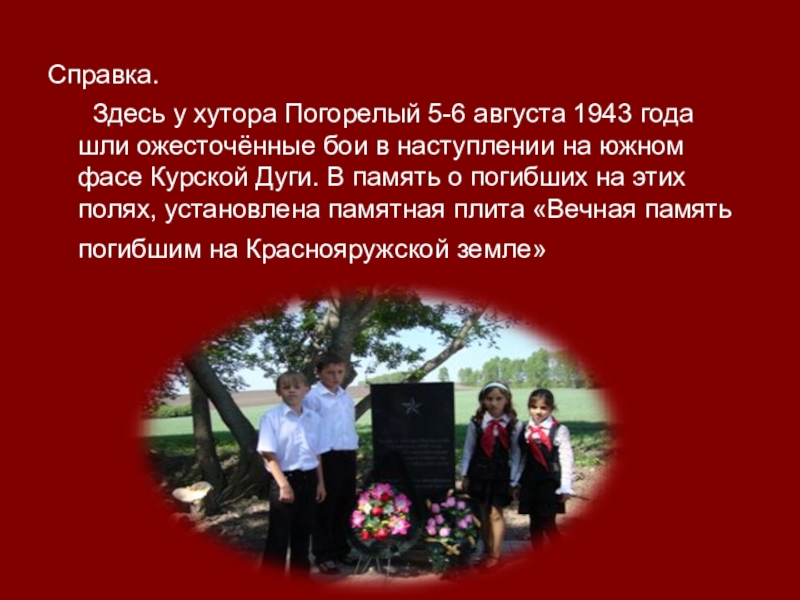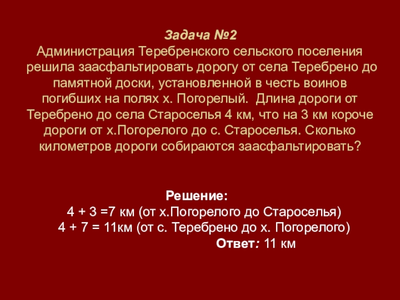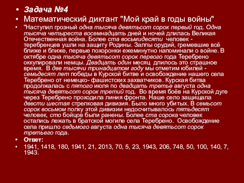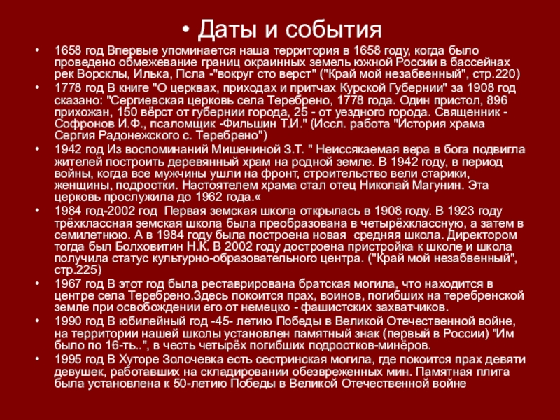 девятьсот сорок первый год. Одна тысяча четыреста восемнадцать дней и ночей длилась Великая Отечественная война. Более ста восьмидесяти человек - теребренцев ушли на защиту Родины. Залпы орудий, гремевшие всё ближе и ближе, первые похоронки ежеминутно напоминали о войне. В октябре одна тысяча девятьсот сорок первого года Теребрено оккупировали немцы. Двадцать один месяц длилось это страшное время. В две тысячи тринадцатом году мы отметим юбилей - семьдесят лет победы в Курской битве и освобождение нашего села Теребрено от немецко- фашистских захватчиков. Курская битва продолжалась с пятого июля по двадцать третье августа одна тысяча девятьсот сорок третий год. Во время боёв на Курской дуге через Теребрено проходила линия фронта. Наше село защищала двести шестая стрелковая дивизия. Было много убитых. В семьсот сорок восьмом полку этой дивизии недосчитывалось пятьдесят человек, сто бойцов были ранены. Более ста сорока человек остались лежать в братской могиле села Теребрено. Освобождение села пришло седьмого августа одна тысяча девятьсот сорок третьего года.