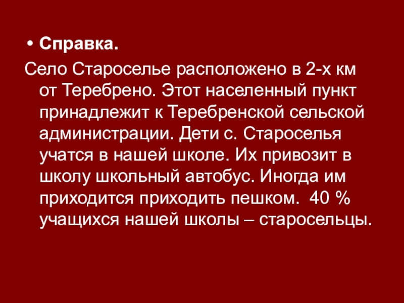 принадлежит к Теребренской сельской администрации. Дети с. Староселья учатся в нашей школе. Их привозит в школу школьный автобус. Иногда им приходится приходить пешком. 40 % учащихся нашей школы – старосельцы.