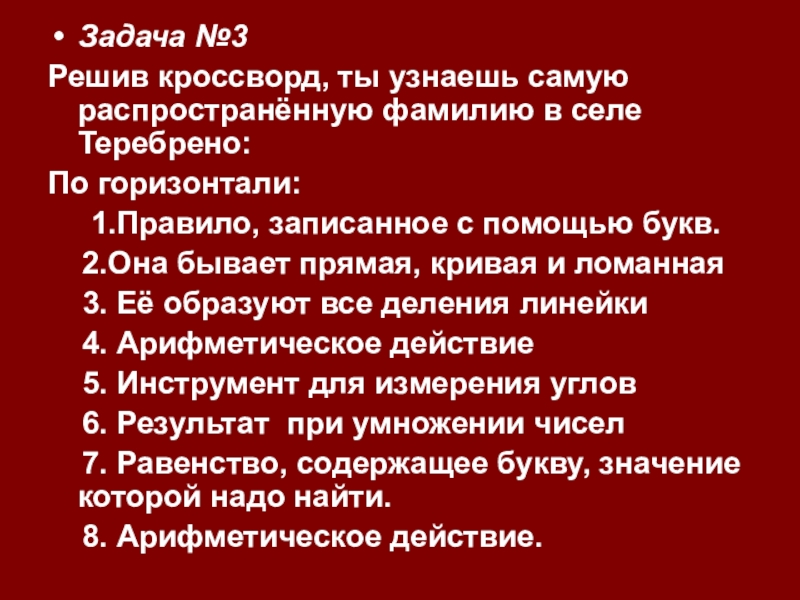 Решив кроссворд, ты узнаешь самую распространённую фамилию в селе Теребрено: