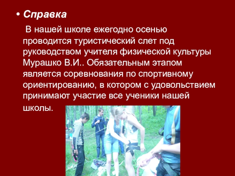 руководством учителя физической культуры Мурашко В.И.. Обязательным этапом является соревнования по спортивному ориентированию, в котором с удовольствием принимают участие все ученики нашей школы.