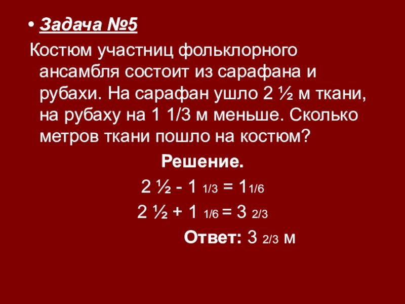 На сарафан ушло 2 ½ м ткани, на рубаху на 1 1/3 м меньше. Сколько метров ткани пошло на костюм?