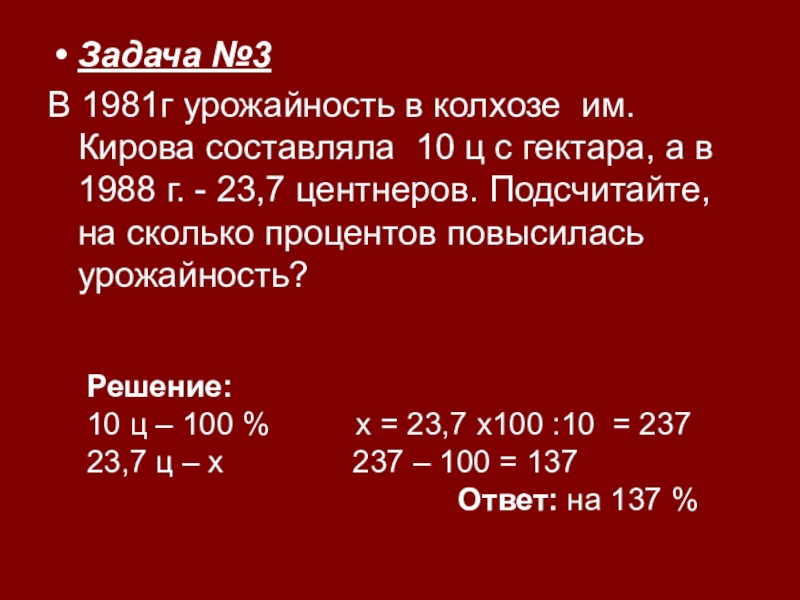 с гектара, а в 1988 г. - 23,7 центнеров. Подсчитайте, на сколько процентов повысилась урожайность?