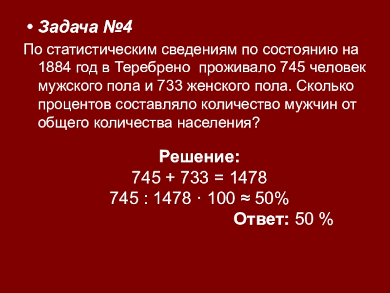 проживало 745 человек мужского пола и 733 женского пола. Сколько процентов составляло количество мужчин от общего количества населения?