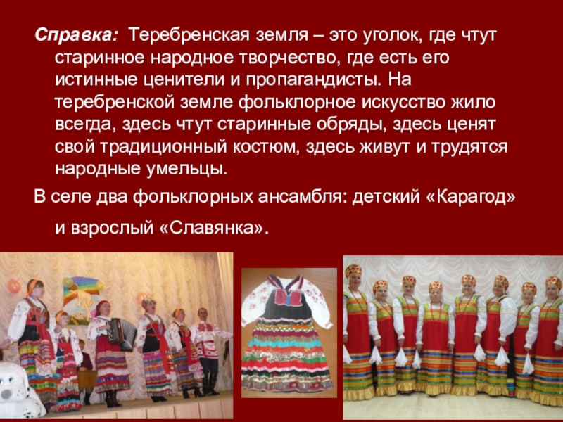 где есть его истинные ценители и пропагандисты. На теребренской земле фольклорное искусство жило всегда, здесь чтут старинные обряды, здесь ценят свой традиционный костюм, здесь живут и трудятся народные умельцы.