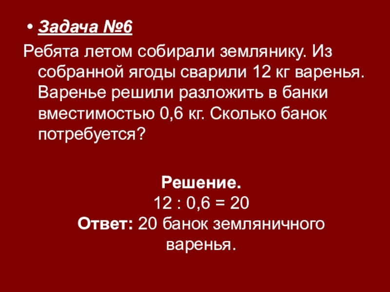 варенья. Варенье решили разложить в банки вместимостью 0,6 кг. Сколько банок потребуется?