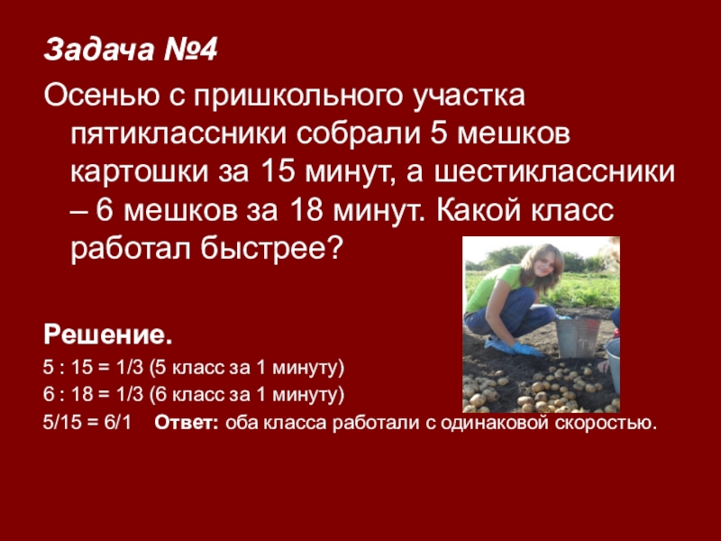 15 минут, а шестиклассники – 6 мешков за 18 минут. Какой класс работал быстрее?