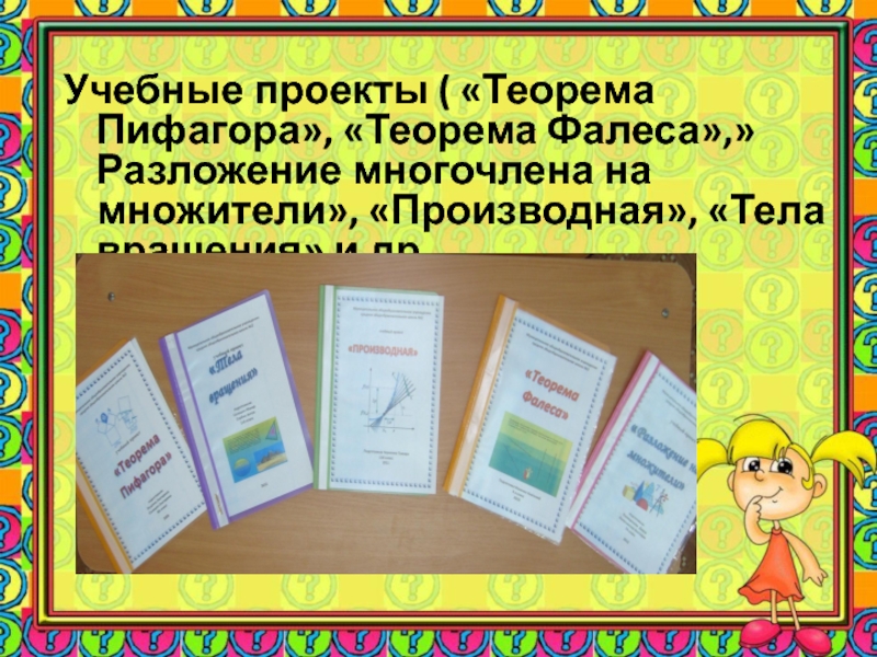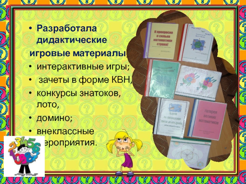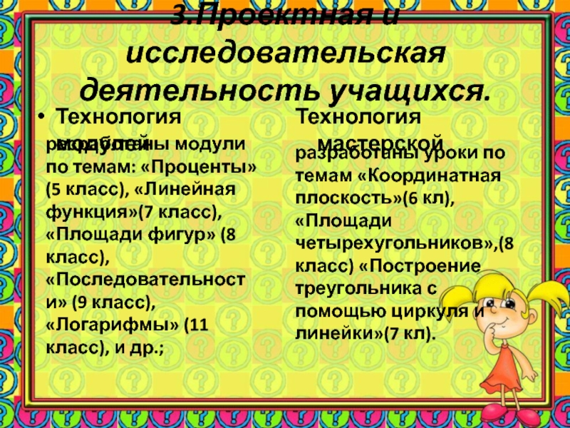 разработаны модули по темам: «Проценты» (5 класс), «Линейная функция»(7 класс), «Площади фигур» (8 класс), «Последовательности» (9 класс), «Логарифмы» (11 класс), и др.;