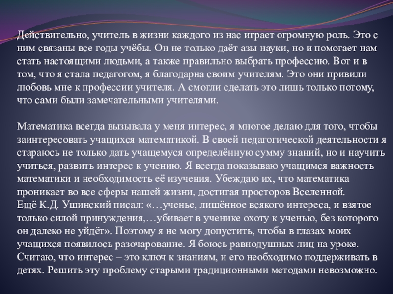 Математика всегда вызывала у меня интерес, я многое делаю для того, чтобы заинтересовать учащихся математикой. В своей педагогической деятельности я стараюсь не только дать учащемуся определённую сумму знаний, но и научить учиться, развить интерес к учению. Я всегда показываю учащимся важность математики и необходимость её изучения. Убеждаю их, что математика проникает во все сферы нашей жизни, достигая просторов Вселенной.