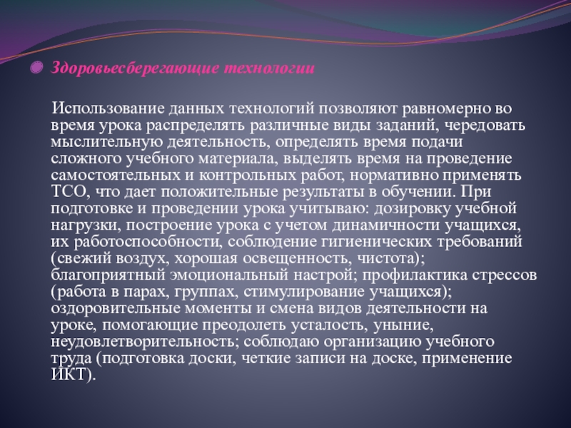 распределять различные виды заданий, чередовать мыслительную деятельность, определять время подачи сложного учебного материала, выделять время на проведение самостоятельных и контрольных работ, нормативно применять ТСО, что дает положительные результаты в обучении. При подготовке и проведении урока учитываю: дозировку учебной нагрузки, построение урока с учетом динамичности учащихся, их работоспособности, соблюдение гигиенических требований (свежий воздух, хорошая освещенность, чистота); благоприятный эмоциональный настрой; профилактика стрессов (работа в парах, группах, стимулирование учащихся); оздоровительные моменты и смена видов деятельности на уроке, помогающие преодолеть усталость, уныние, неудовлетворительность; соблюдаю организацию учебного труда (подготовка доски, четкие записи на доске, применение ИКТ).