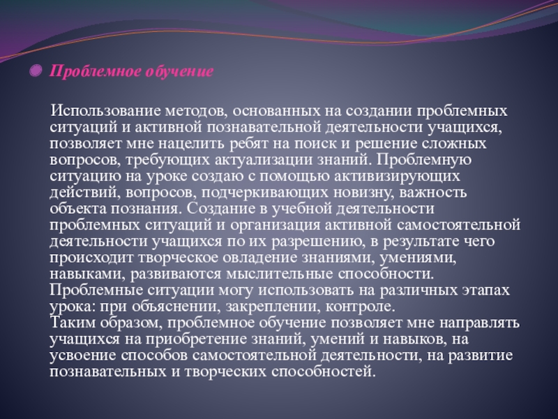 Таким образом, проблемное обучение позволяет мне направлять учащихся на приобретение знаний, умений и навыков, на усвоение способов самостоятельной деятельности, на развитие познавательных и творческих способностей.