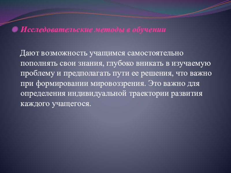 знания, глубоко вникать в изучаемую проблему и предполагать пути ее решения, что важно при формировании мировоззрения. Это важно для определения индивидуальной траектории развития каждого учащегося.