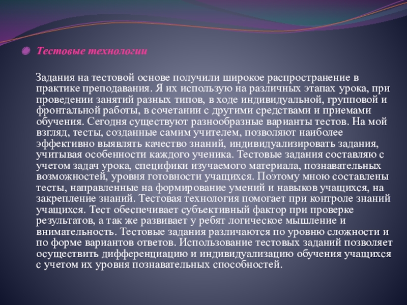 практике преподавания. Я их использую на различных этапах урока, при проведении занятий разных типов, в ходе индивидуальной, групповой и фронтальной работы, в сочетании с другими средствами и приемами обучения. Сегодня существуют разнообразные варианты тестов. На мой взгляд, тесты, созданные самим учителем, позволяют наиболее эффективно выявлять качество знаний, индивидуализировать задания, учитывая особенности каждого ученика. Тестовые задания составляю с учетом задач урока, специфики изучаемого материала, познавательных возможностей, уровня готовности учащихся. Поэтому мною составлены тесты, направленные на формирование умений и навыков учащихся, на закрепление знаний. Тестовая технология помогает при контроле знаний учащихся. Тест обеспечивает субъективный фактор при проверке результатов, а так же развивает у ребят логическое мышление и внимательность. Тестовые задания различаются по уровню сложности и по форме вариантов ответов. Использование тестовых заданий позволяет осуществить дифференциацию и индивидуализацию обучения учащихся с учетом их уровня познавательных способностей.