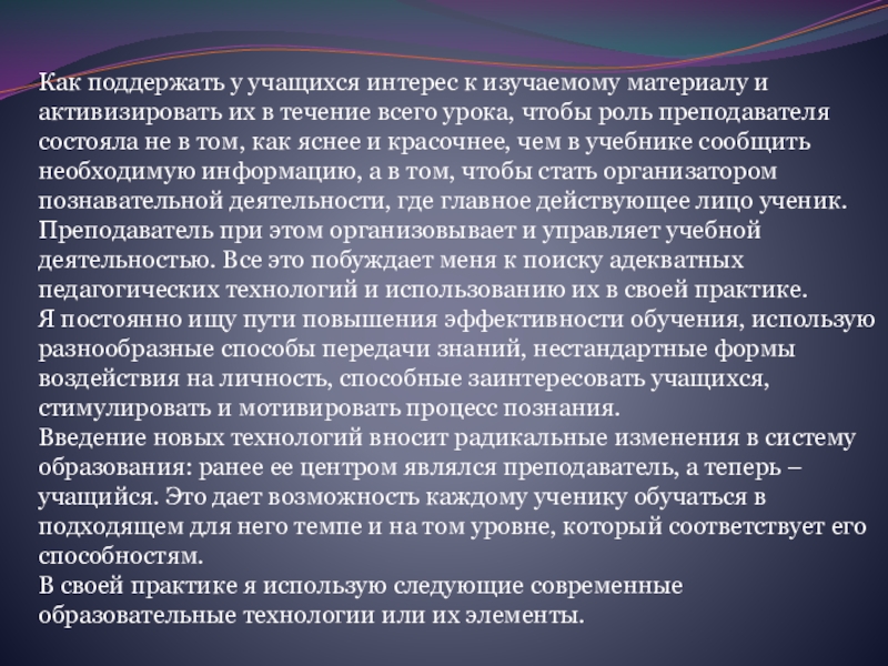 в течение всего урока, чтобы роль преподавателя состояла не в том, как яснее и красочнее, чем в учебнике сообщить необходимую информацию, а в том, чтобы стать организатором познавательной деятельности, где главное действующее лицо ученик. Преподаватель при этом организовывает и управляет учебной деятельностью. Все это побуждает меня к поиску адекватных педагогических технологий и использованию их в своей практике.