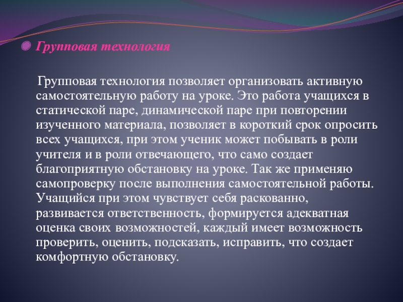 Групповая технология позволяет организовать активную самостоятельную работу на