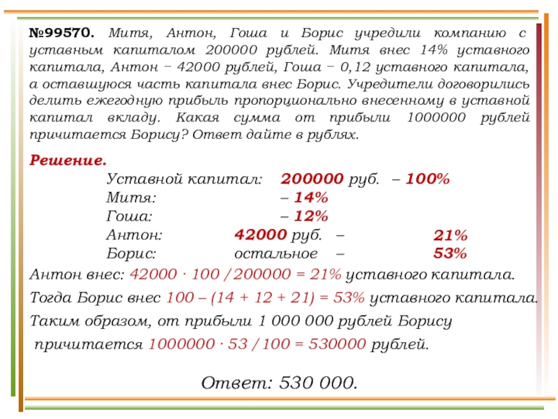 Тогда Борис внес 100 – (14 + 12 + 21) = 53% уставного капитала.