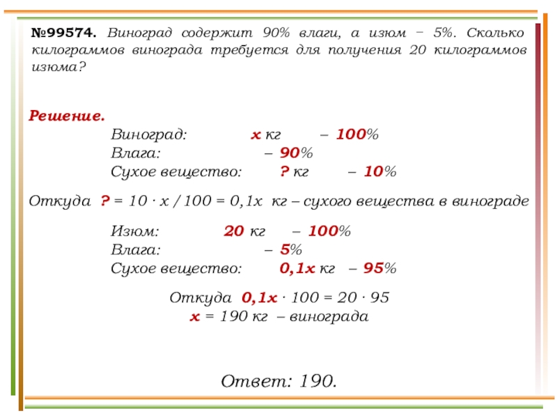 Откуда ? = 10 · х /100 = 0,1х кг – сухого вещества в винограде