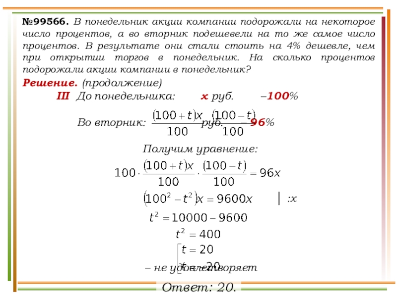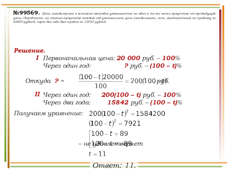 Цена холодильника в магазине ежегодно уменьшается на одно и то же число процентов от предыдущей цены. Определите, на сколько процентов каждый год уменьшалась цена холодильника, если, выставленный на продажу за 20000 рублей, через два года был продан за 15842 рублей.