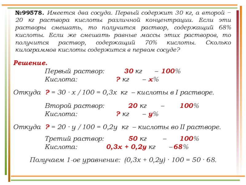 №99578. Имеется два сосуда. Первый содержит 30 кг, а второй − 20 кг раствора кислоты различной концентрации. Если эти растворы смешать, то получится раствор, содержащий 68% кислоты. Если же смешать равные массы этих растворов, то получится раствор, содержащий 70% кислоты. Сколько килограммов кислоты содержится в первом сосуде?