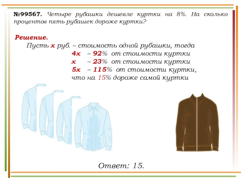 Четыре рубашки дешевле куртки на 8%. На сколько процентов пять рубашек дороже куртки?