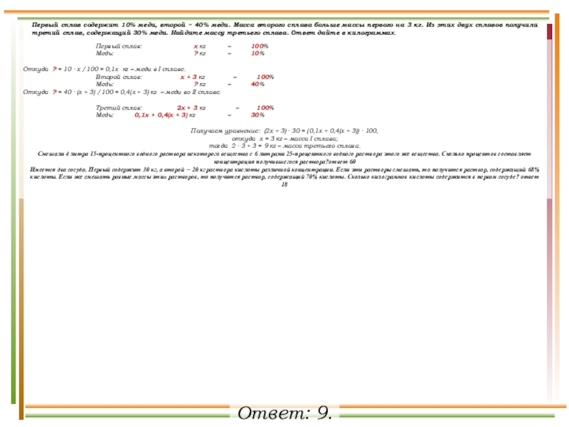 Откуда ? = 30 · (200 – х) /100 = 0,3(200 – х) кг – никеля во II сплаве.