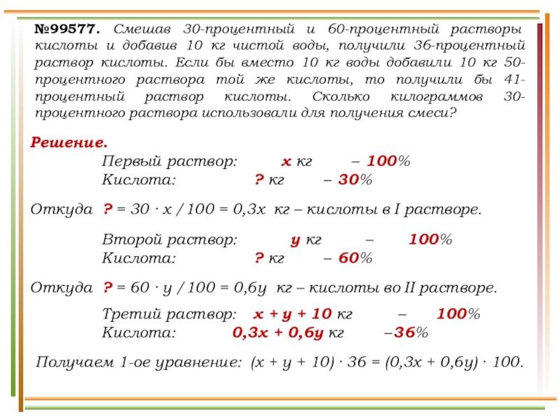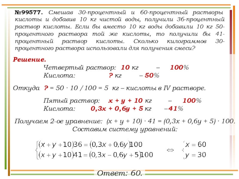 №99577. Смешав 30-процентный и 60-процентный растворы кислоты и добавив 10 кг чистой воды, получили 36-процентный раствор кислоты. Если бы вместо 10 кг воды добавили 10 кг 50-процентного раствора той же кислоты, то получили бы 41-процентный раствор кислоты. Сколько килограммов 30-процентного раствора использовали для получения смеси?