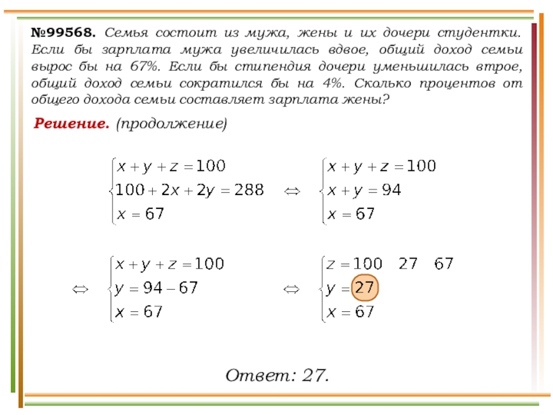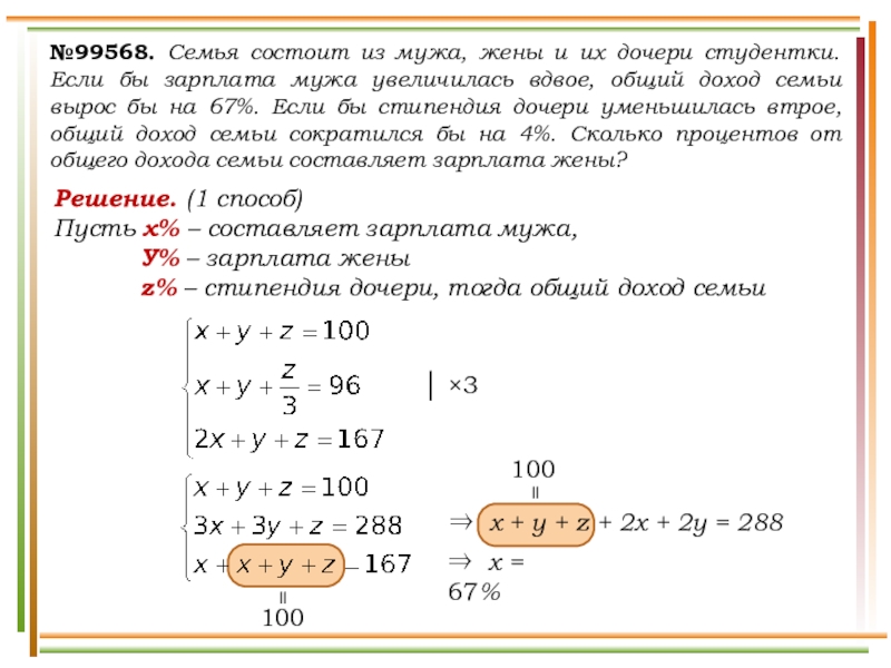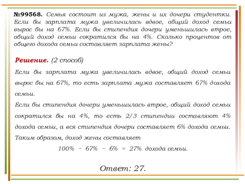 Если бы зарплата мужа увеличилась вдвое, общий доход семьи вырос бы на 67%, то есть зарплата мужа составляет 67% дохода семьи.