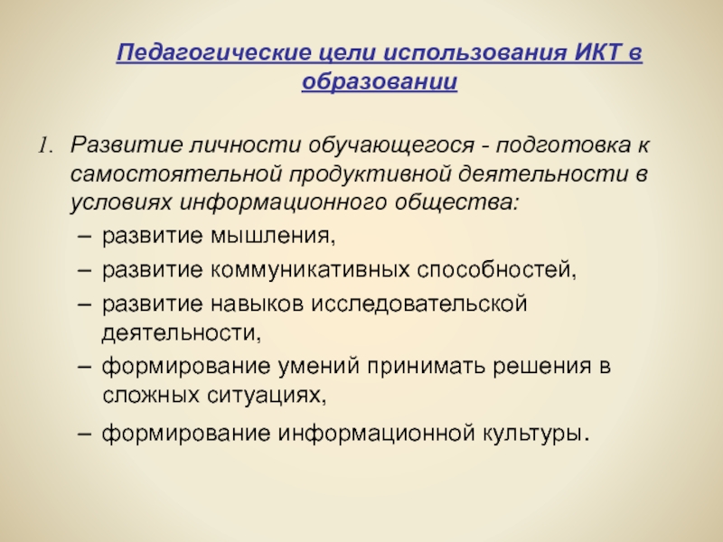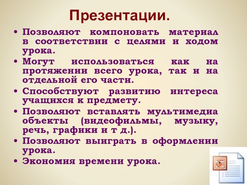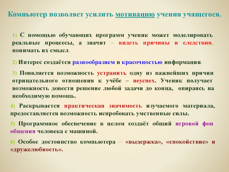 1) С помощью обучающих программ ученик может моделировать реальные процессы, а значит – видеть причины и следствия, понимать их смысл.
