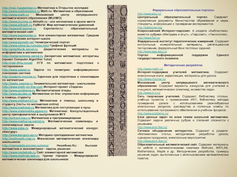 Интернет-поддержка учителей математики. Содержит электронные книги, видеолекции, материалы для уроков.