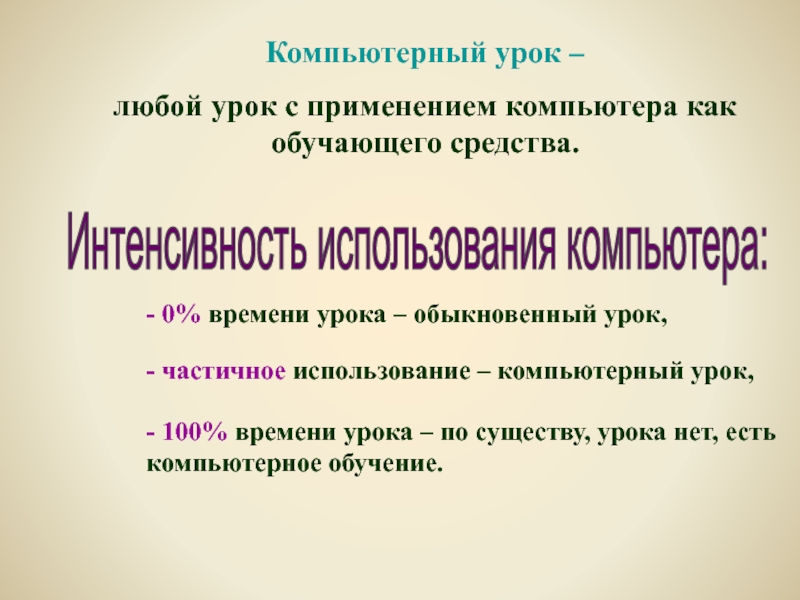 - 100% времени урока – по существу, урока нет, есть компьютерное обучение.