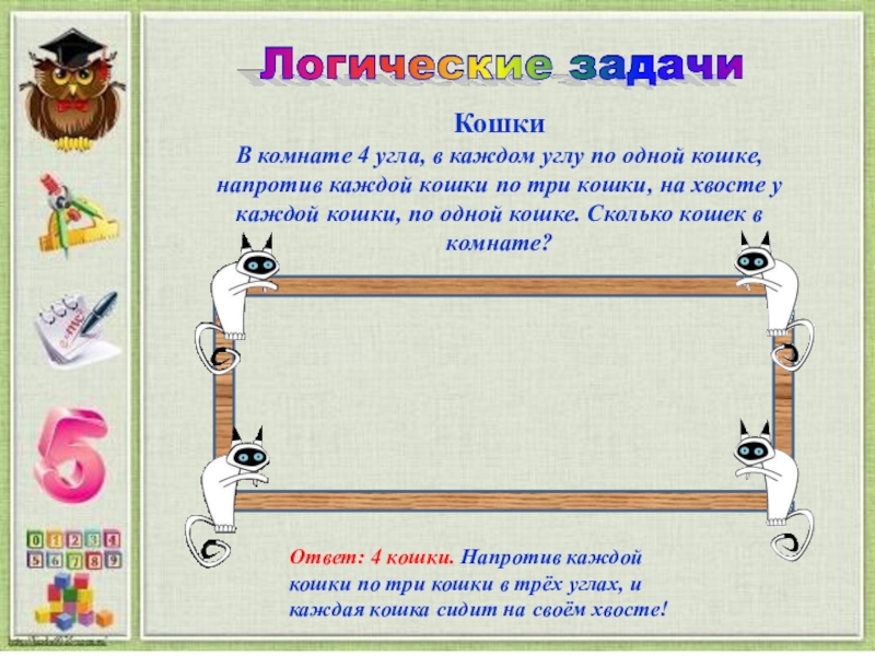 Ответ: 4 кошки. Напротив каждой кошки по три кошки в трёх углах, и каждая кошка сидит на своём хвосте!