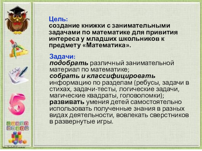 создание книжки с занимательными задачами по математике для привития интереса у младших школьников к предмету «Математика».