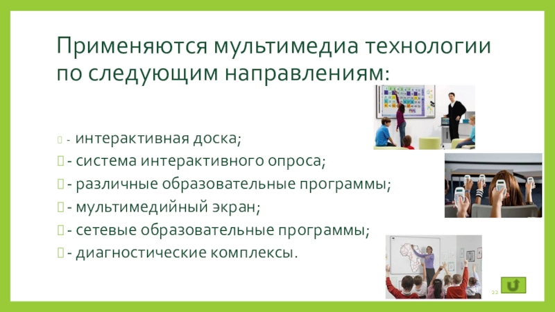 Слайд 22Применяются мультимедиа технологии по следующим направлениям:
