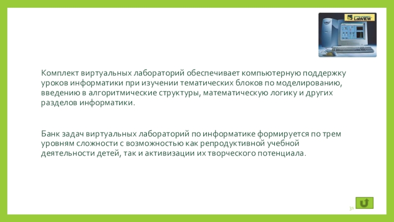 Слайд 31Комплект виртуальных лабораторий обеспечивает компьютерную поддержку уроков информатики при изучении тематических