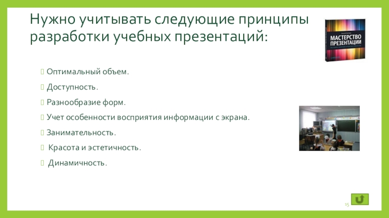 Слайд 15Нужно учитывать следующие принципы разработки учебных презентаций: