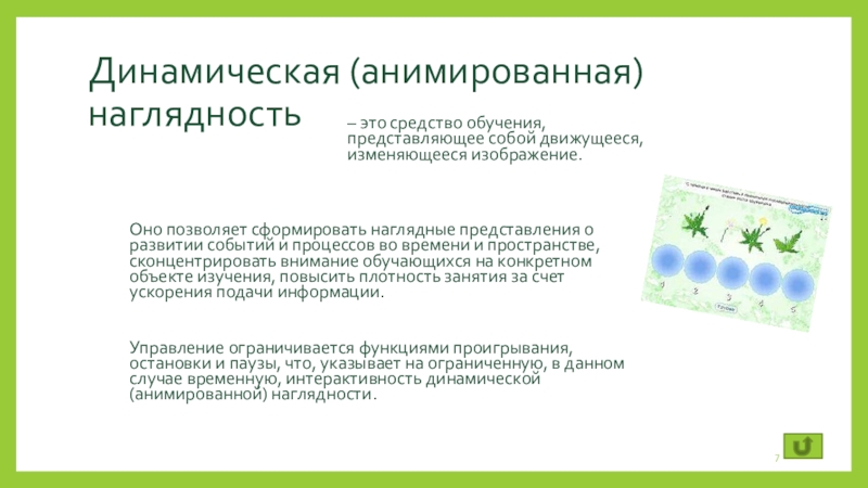 Управление ограничивается функциями проигрывания, остановки и паузы, что, указывает на ограниченную, в данном случае временную, интерактивность динамической (анимированной) наглядности.