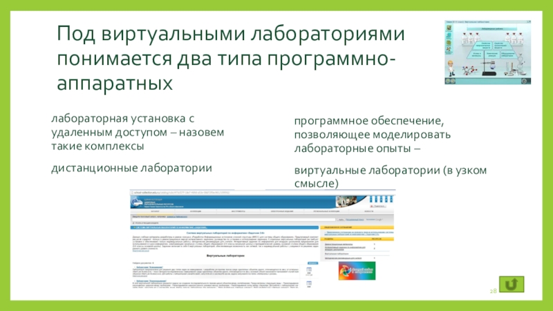 Слайд 28Под виртуальными лабораториями понимается два типа программно-аппаратных