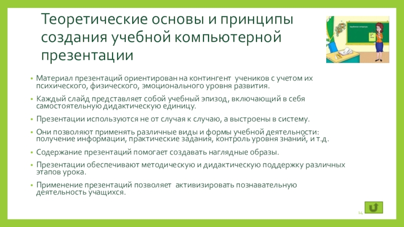 Слайд 14Теоретические основы и принципы создания учебной компьютерной презентации